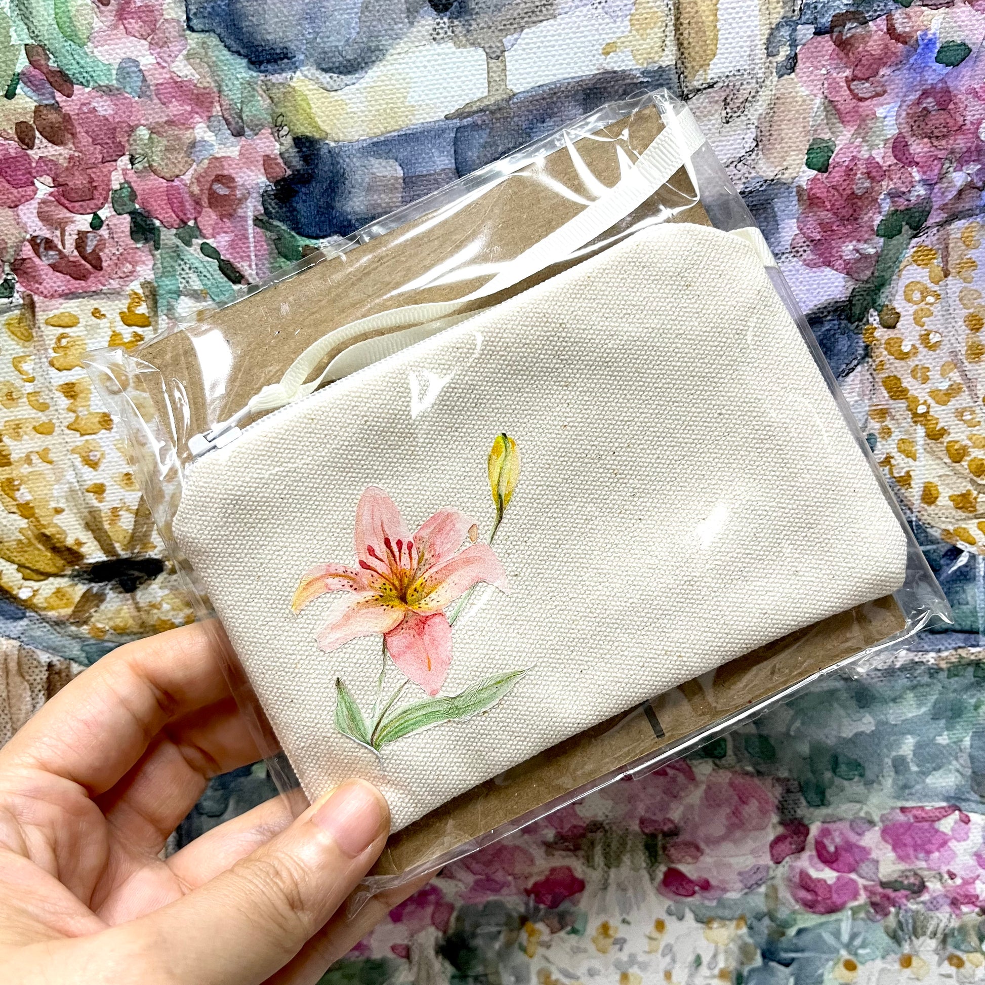 Monedero estampado, con ilustraciones originales de flores pintadas a a mano en acuarela.